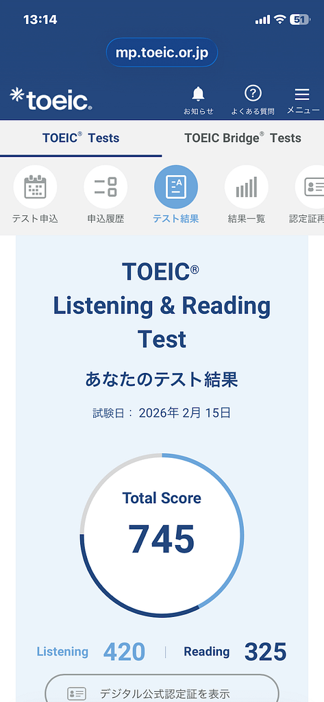 結果は745点でした。公式問題集の点数通りの実力ですね。